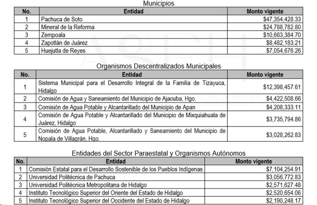 Del monto observado, 137.9 millones de pesos corresponden a municipios; 49.3 millones, a organismos descentralizados municipales; y 24 millones, a entidades del sector paraestatal y organismos autónomos. Entre los municipios con mayores observaciones destacan Pachuca de Soto (47.3 millones de pesos) y Mineral de la Reforma (24.7 millones), seguidos por Zempoala, Zapotlán de Juárez y Huejutla de Reyes. En el ámbito descentralizado, el Sistema DIF Tizayuca encabeza la lista con 12.3 millones de pesos en irregularidades, seguido por las comisiones de agua de Ajacuba, Apan, Mixquiahuala y Nopala, con montos que oscilan entre 3 y 4 millones de pesos.