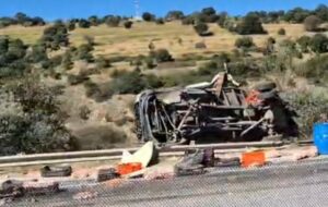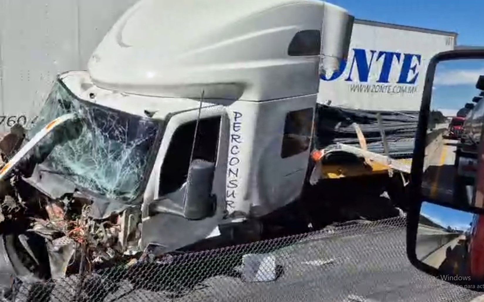 Un tráiler quedó sobre su costado izquierdo en la orilla de la vialidad, mientras que otro pesado vehículo de color blanco que transportaba varilla, termino con la cabina destrozada y el motor desprendido en el centro de los carriles.