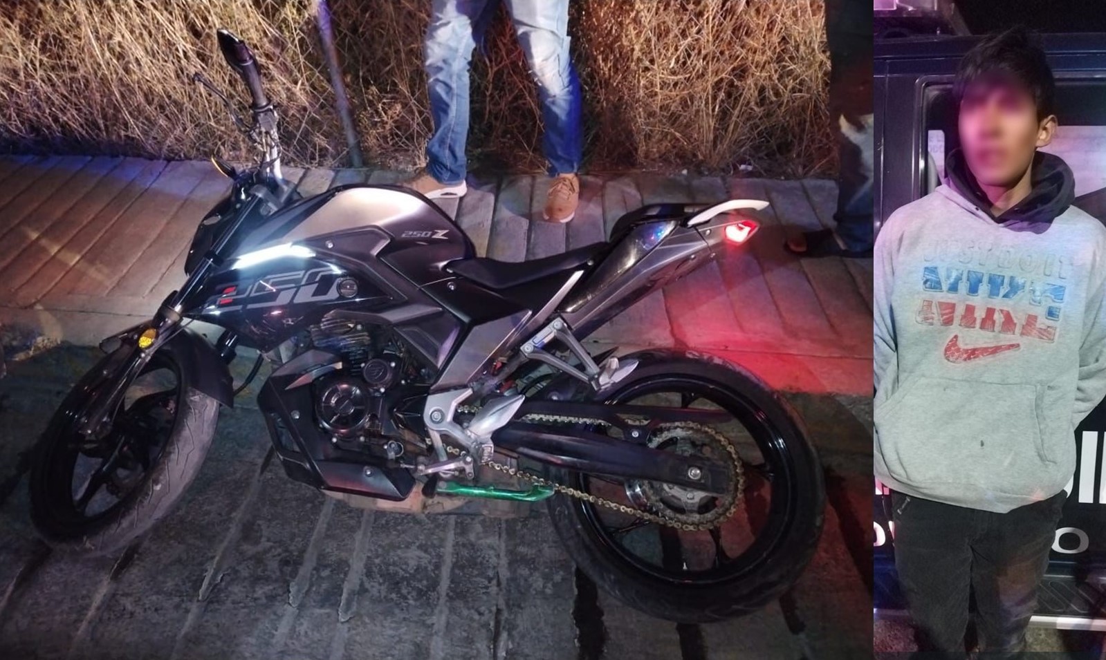 El detenido corresponde a un adolescente de 17 años identificado con las iniciales P.J.E.B. Entre los indicios asegurados se encontró una bolsa transparente tipo ziploc con material granulado en su interior, así como cuatro bolsas más de color amarillo con contenido similar. También se recuperó una motocicleta Italika, submarca 250Z, color negro y sin placa de circulación, la cual contaba con reporte de robo registrado el 25 de noviembre de 2025 en Plaza Gran Patio.