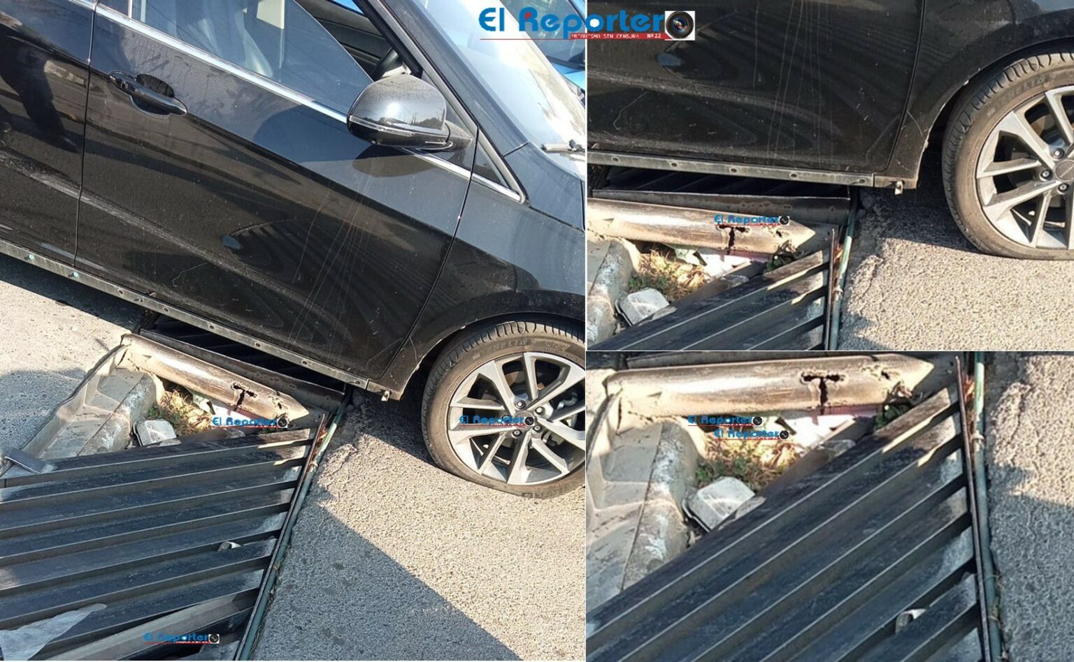 Lamentablemente, por mal estado de la infraestructura urbana, el coche destrozo su neumático delantero izquierdo al caer en una coladera de estructura metaliza despedazada.