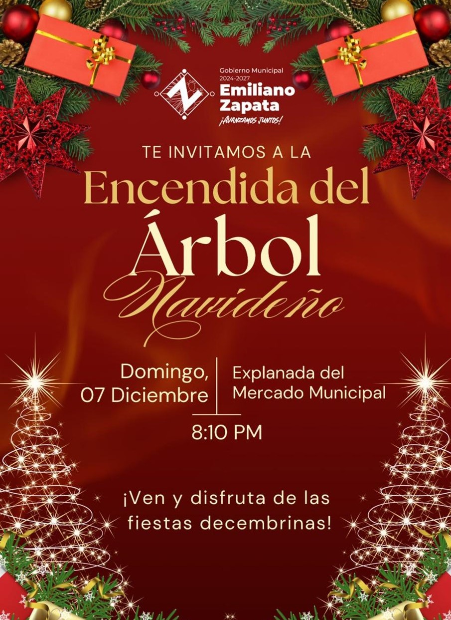 EMILIANO ZAPATA, Hgo. – La esperada magia de la Navidad ha llegado a Emiliano Zapata, la noche del próximo domingo, asiste y disfruta el encendido del Árbol de Navidad en la explanada del mercado municipal.