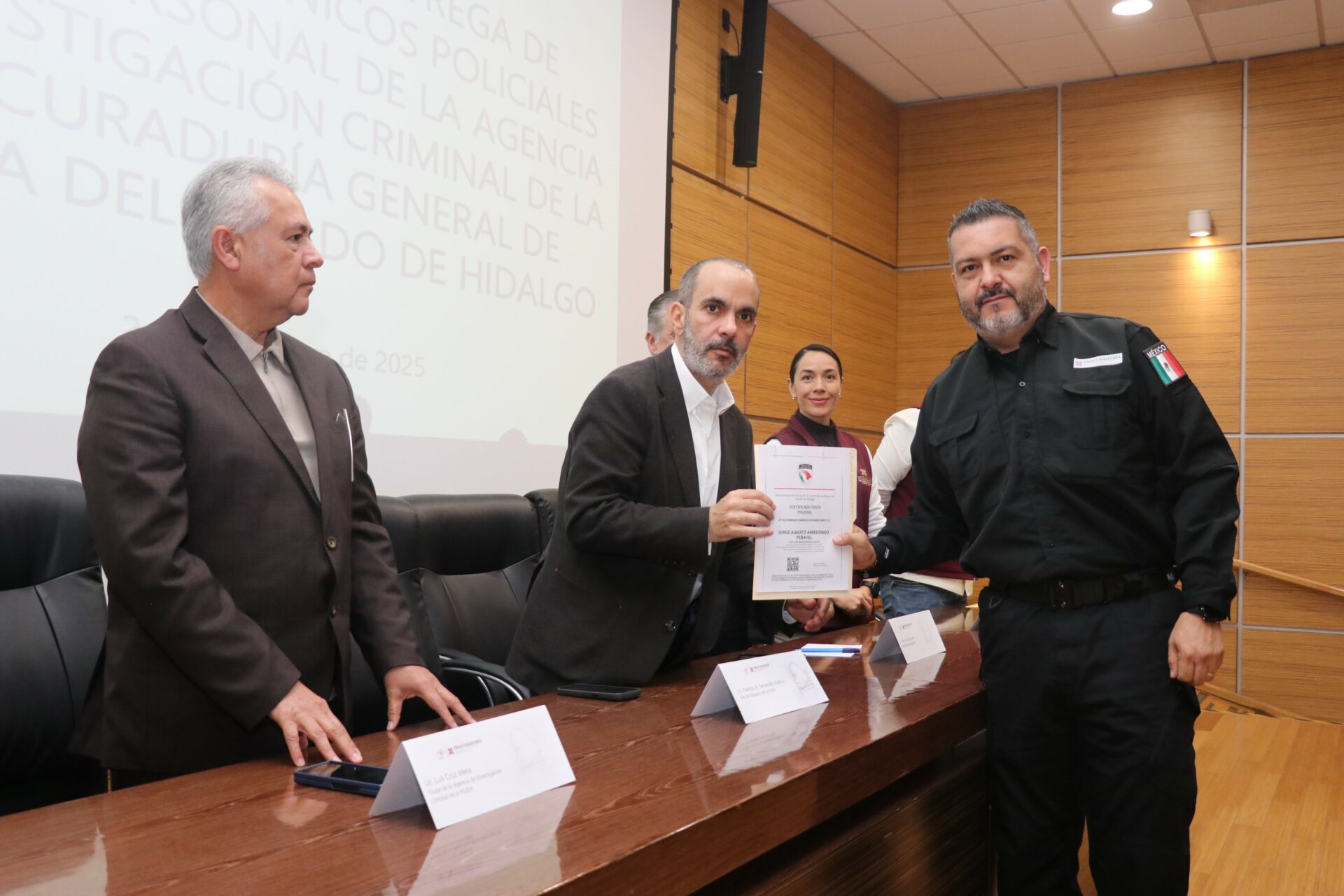 PACHUCA, Hgo. – A través de la implementación de acciones estratégicas para la certificación del personal de la División de Investigación, 220 elementos de la Agencia de Investigación Criminal (AIC) de la Procuraduría General de Justicia del Estado de Hidalgo (PGJEH), obtuvieron su Certificado Único Policial, el cual avala que cuentan con los conocimientos, perfil, habilidades y aptitudes necesarias para el desarrollo de sus funciones.