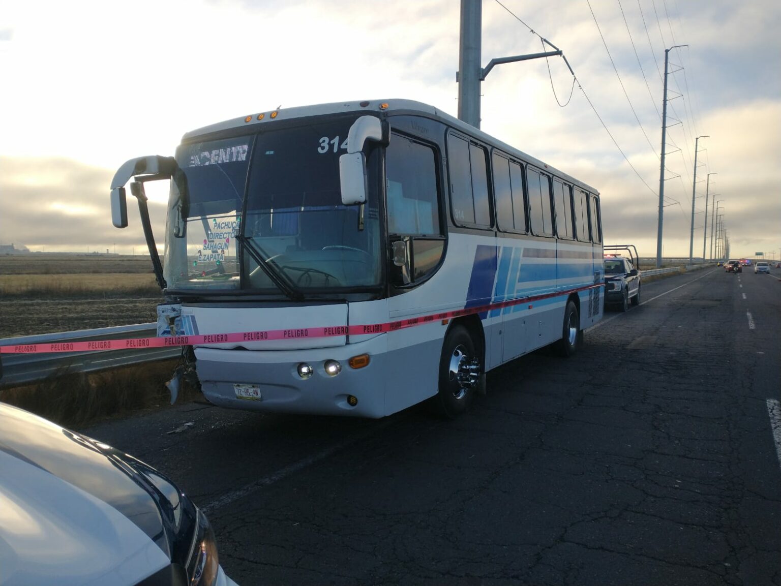 El autobús de pasajeros de color blanco con franjas azules, marca Mercedez Benz, modelo 2009, placas 72HB4W, propiedad de la empresa Autotransportes de Hidalgo embistió por alcance el coche Nissan Sentra, color verde, sin matricula, por el impactó el conductor sale proyectado y muere en el lugar, personal de Protección Civil nada pudo hacer por salvarle la ida.