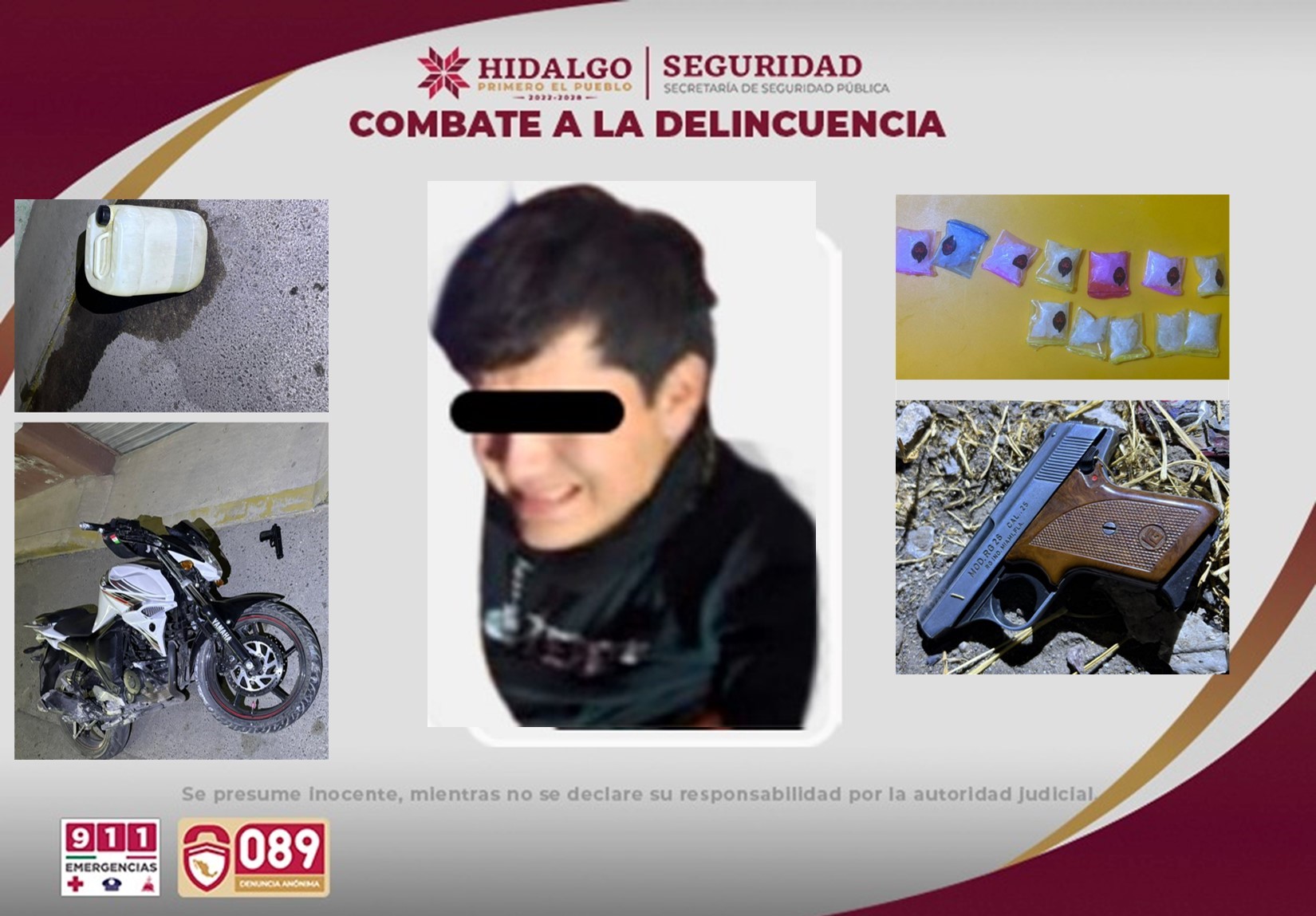 En el lugar de los hechos, se logró el aseguramiento de un arma corta calibre .25, con su respectivo cargador abastecido, además de un arma de utilería, un garrafón de plástico que contenía hidrocarburo, así como 12 dosis de presunta droga con características del cristal. Todos los indicios, así como los sujetos, quedaron a disposición de la autoridad ministerial para el seguimiento de las investigaciones correspondientes.