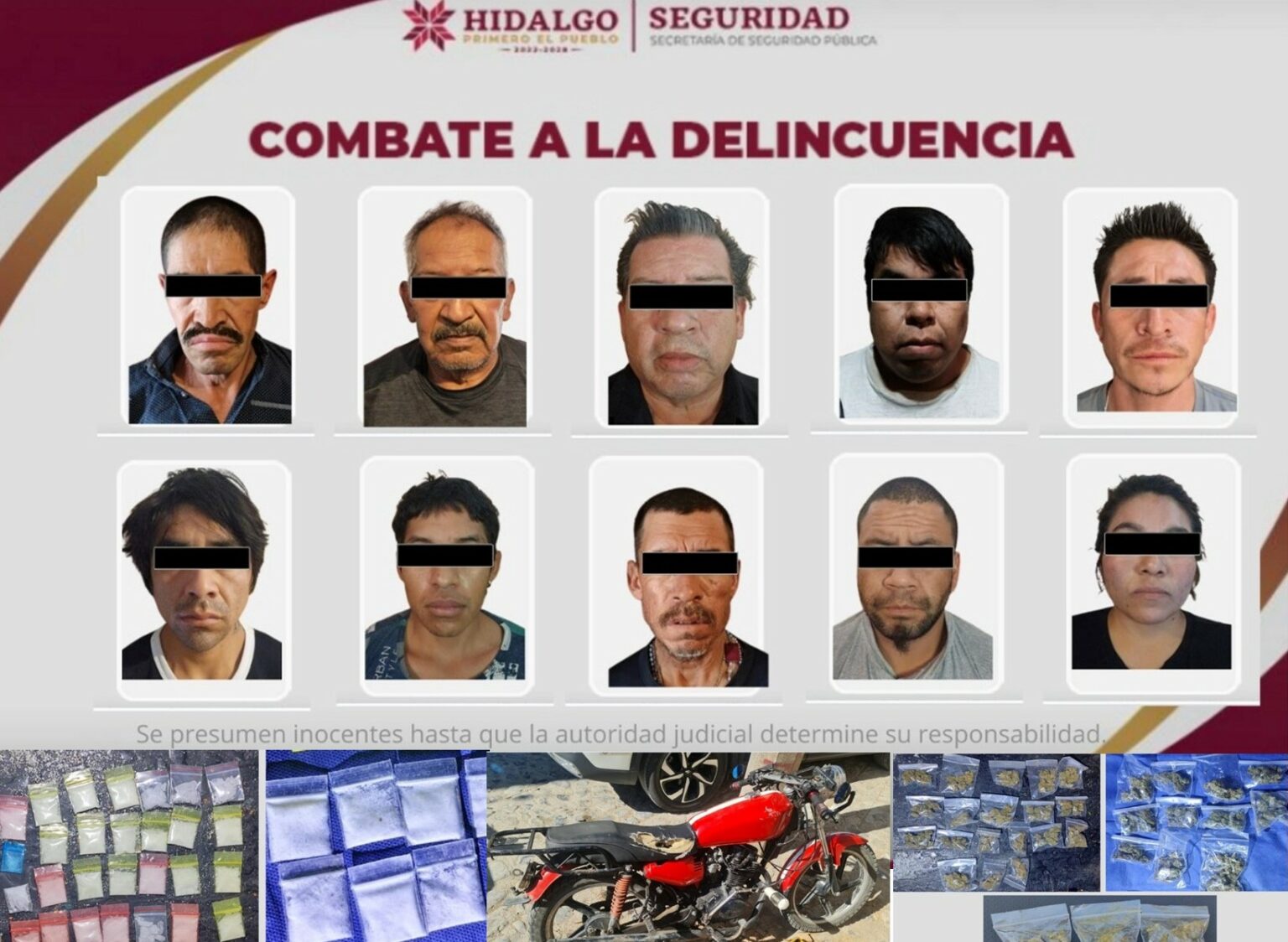 Como resultado de estas acciones, fueron asegurados dos predios utilizados como puntos de venta de droga en el municipio de Metztitlán, junto con 10 personas dedicadas a la distribución de sustancias ilícitas, así como 450 dosis de diversos estupefacientes y una motocicleta con reporte de robo vigente, evitando que dichos narcóticos llegaran a las calles.