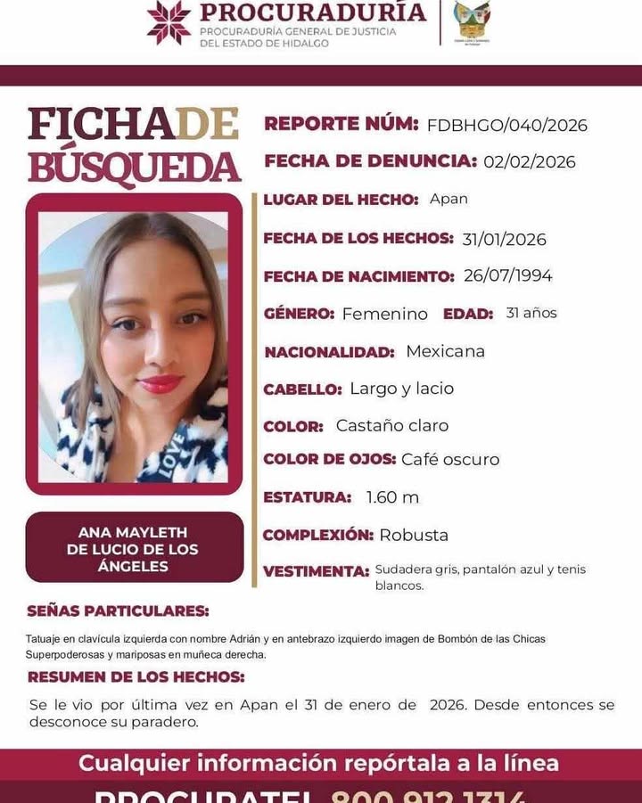 APAN, Hgo. – Hacemos la invitación a todos nuestros estimados lectores, seguidores y amigos en general a unir esfuerzos para localizar a ANA MAYLETH DE LUCIO DE LOS ANGELES, de 31 años, mima que esta como no localizada desde el día 31 de enero del año en curso.