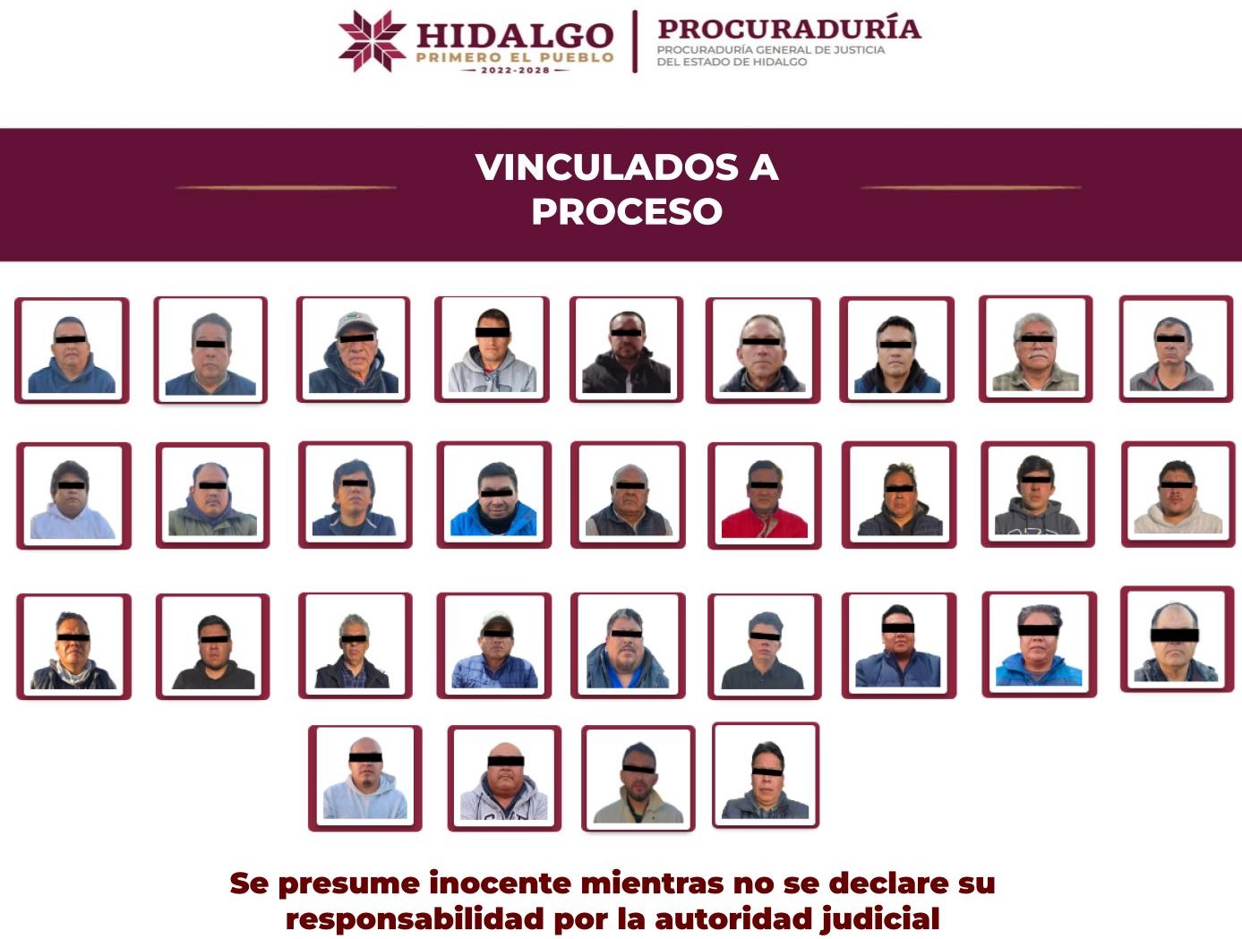 En esa misma fecha, las 31 personas restantes, investigadas por resistencia de particulares y pandilla, y una de ellas además por portación de arma de fuego, se acogieron a la duplicidad del plazo de 144 horas para resolver su situación jurídica y esta tarde la PGJEH obtuvo de la autoridad judicial el auto de vinculación a proceso.
