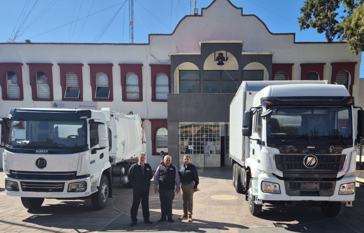 Dijo que son potentes camiones de la prestigiada marca DINA y orgullosamente fabricados en Ciudad Sahagún, municipio de Tepeapulco, Hidalgo.