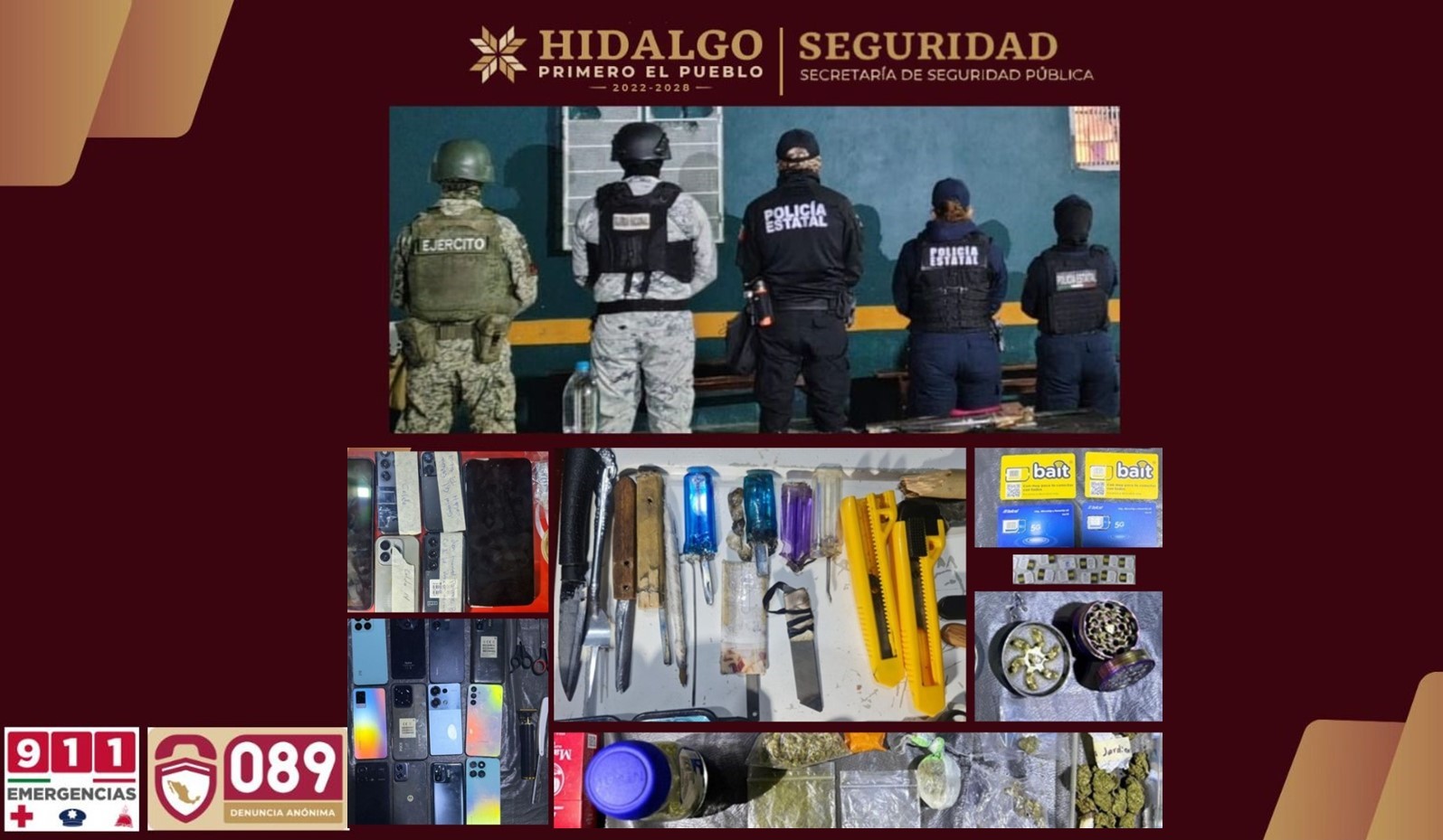 Como parte de las labores permanentes de supervisión en el sistema penitenciario de Hidalgo y en seguimiento a la Estrategia Nacional contra la Extorsión, personal de la Secretaría de Seguridad Pública de Hidalgo (SSPH) realizó acciones de revisión al interior de los Centros de Reinserción Social (Ceresos) de Pachuca de Soto y Tulancingo, en coordinación con elementos de la Secretaría de la Defensa Nacional (Sedena) y la Guardia Nacional (GN).