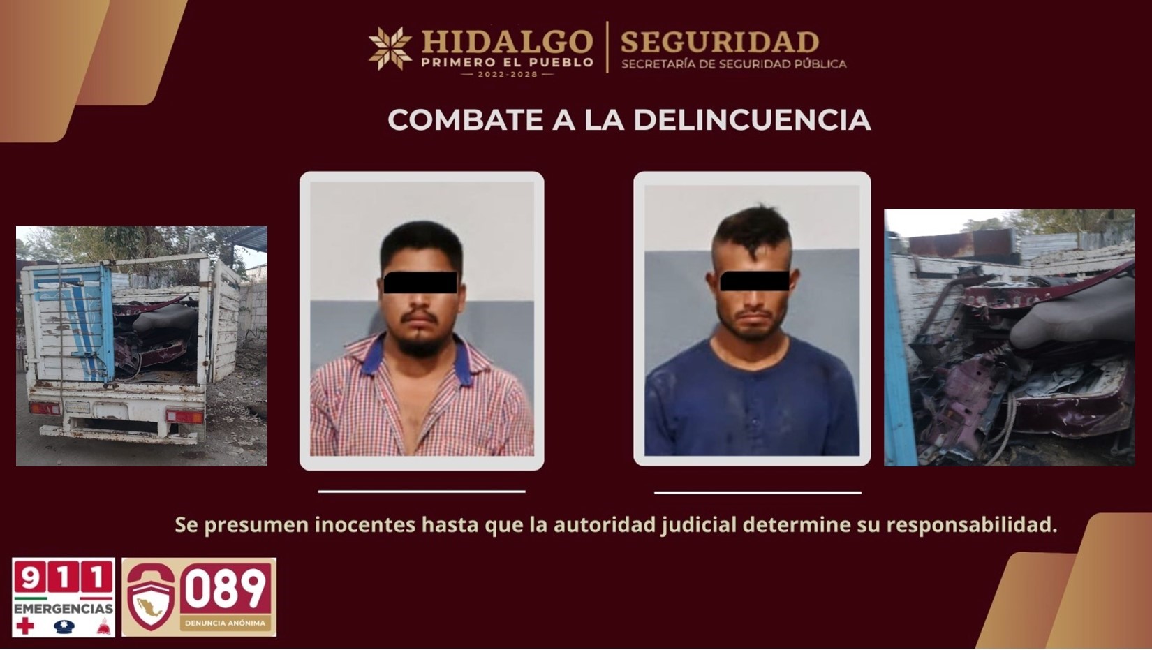 Durante la inspección en la zona, los agentes estatales localizaron a los dos hombres en posesión de las autopartes recién retiradas, mismas que correspondían al vehículo señalado en el reporte. En la camioneta en la que pretendían retirarse también se encontraron herramientas utilizadas para desmontar las piezas, entre ellas palas, picos, conos y señalización preventiva.