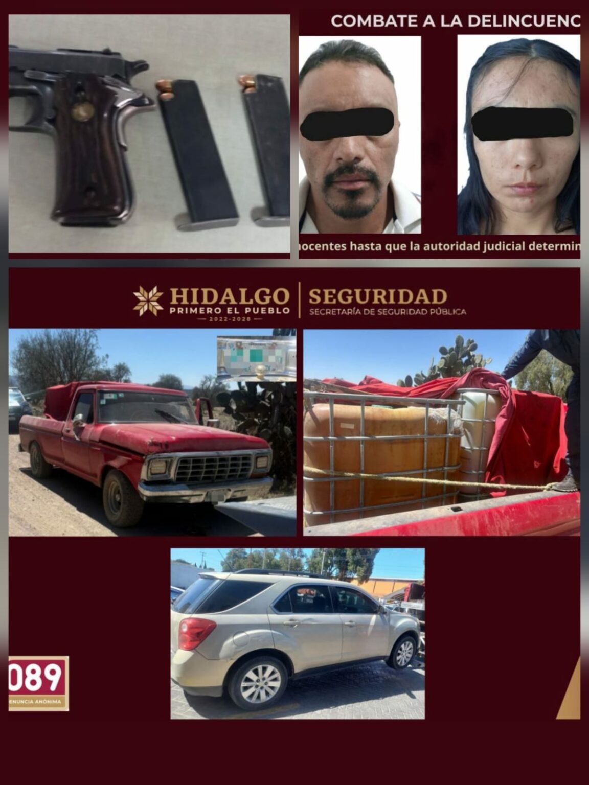 La intervención, realizada en la comunidad de Santiago Tepeyahualco, municipio de Zempoala, permitió decomisar aproximadamente 2 mil litros de hidrocarburo, distribuidos en dos contenedores tipo muela con capacidad de mil litros cada uno, así como una camioneta Ford F100 color rojo y una Chevrolet Equinox color champagne, ambas con placas del Estado de México.