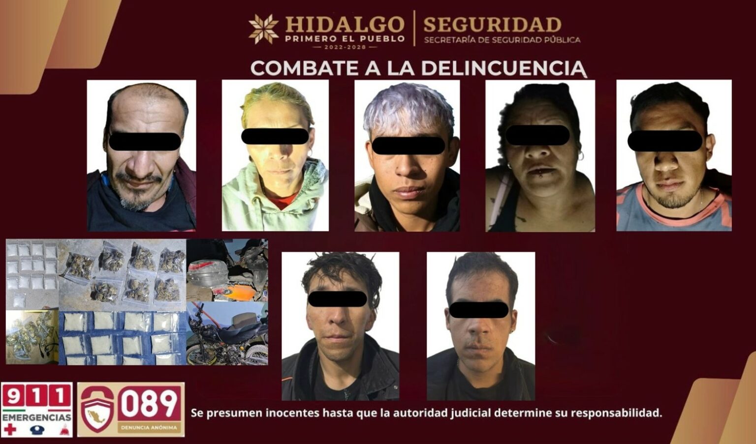 Siete personas presuntamente dedicadas al narcomenudeo fueron aseguradas en el municipio de Tizayuca, entre ellas un individuo identificado como “El Narizón”, señalado como posible líder de la célula; además, se decomisaron 383 dosis de presunta droga entre cristal y marihuana, así como dos motocicletas sin placas utilizadas para la distribución de estas sustancias.