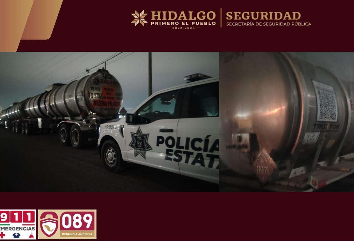 PACHUCA, Hgo. – Más de 67 mil litros de diesel y 37 toneladas de cemento fueron recuperados por elementos de la Secretaría de Seguridad Pública de Hidalgo (SSPH), como resultado de acciones operativas implementadas en carreteras federales tras el reporte de robo de transporte de carga.