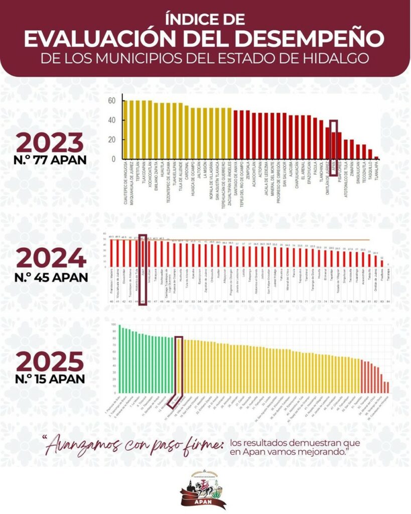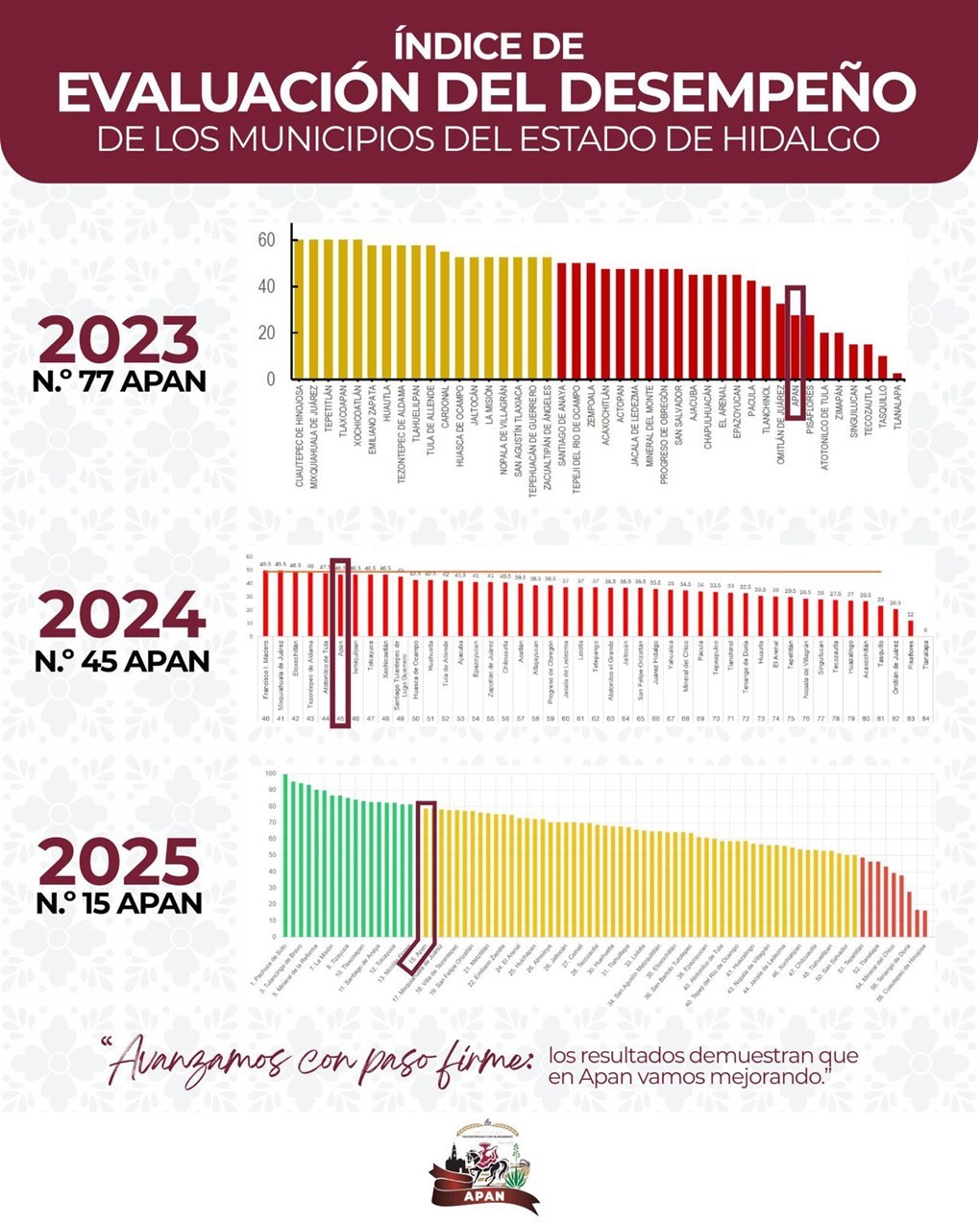 El Gobierno Municipal de Apan que encabeza la presidenta municipal, Dra. María Zorayda Robles Barrera registra un avance significativo en el Índice de Evaluación del Desempeño de los Municipios del Estado de Hidalgo 2025, al posicionarse en el lugar 15 a nivel estatal, de acuerdo con los resultados publicados por la Auditoría Superior del Estado de Hidalgo.