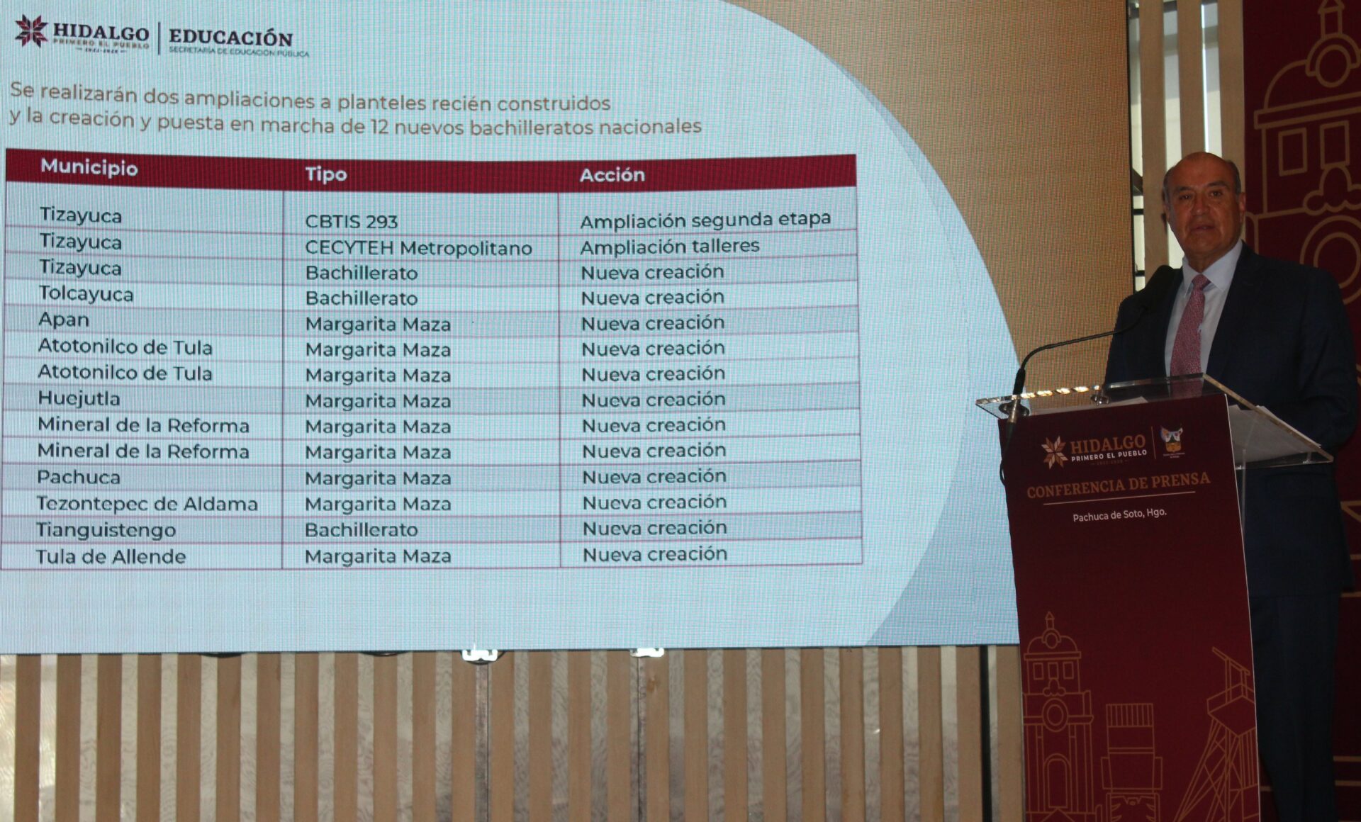 Los proyectos contemplan la ampliación de dos planteles existentes en Tizayuca, 12 bachilleratos de nueva creación que operarán bajo la denominación Bachillerato General “Margarita Maza” y estarán distribuidos en los municipios de Atotonilco de Tula con dos planteles, Apan, Huejutla, Mineral de la Reforma con dos sedes, Pachuca, Tezontepec de Aldama, Tianguistengo, Tizayuca y Tula de Allende.